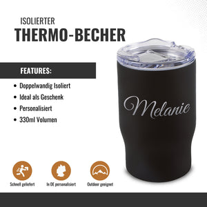 Der 330-ml Edelstahlbecher hält deinen Kaffee länger warm und wird mit deiner individuellen Gravur zu einem echten Unikat. Perfekt für Büro, Zuhause, Outdoor – und als Geschenk, das jeden Tag genutzt wird.